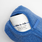"this is rich." is een luchtige body butter die een droge, veeleisende huid onmiddellijk comfort en zachtheid biedt. De romige blend op basis van rijst en kokos versmelt onmiddellijk met de huid en hydrateert intensief tot 48 uur lang. Dankzij een krachtige combinatie van 10% sheaboter, jojoba-esters en hyaluronzuur herstelt en beschermt deze butter de huidbarrière terwijl het comfort en elasticiteit terugbrengt. Niacinamide versterkt en egaliseert de huid. Bakuchiol, het plantaardig alternatief voor retinol, stimuleert celvernieuwing en verbetert de stevigheid van de huid zonder irritatie. De subtiele geur van granaatappel, citrus en zachte bloemen maakt de ervaring compleet.